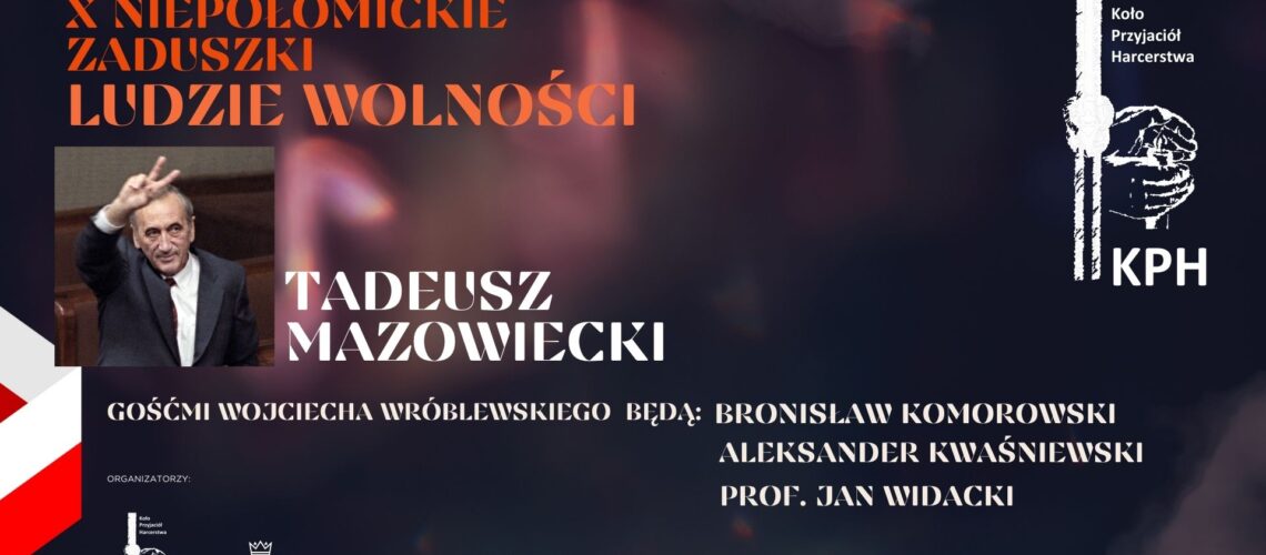 Zapraszamy serdecznie na Jubileuszowe X Niepołomickie Zaduszki „Ludzie Wolności”. W tym roku wspominać będziemy postać pierwszego premiera III Rzeczpospolitej Polskiej Tadeusza Mazowieckiego.